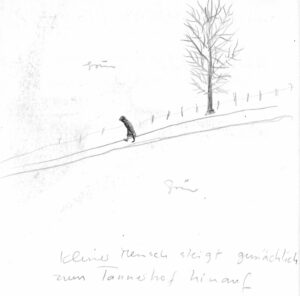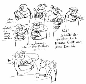 Jutta Bauer teilt mit uns Entwürfe und Skizzen, von denen manche so fragil und undefiniert sind wie die flüchtigen Gedanken, die sie versuchen fest zu halten.